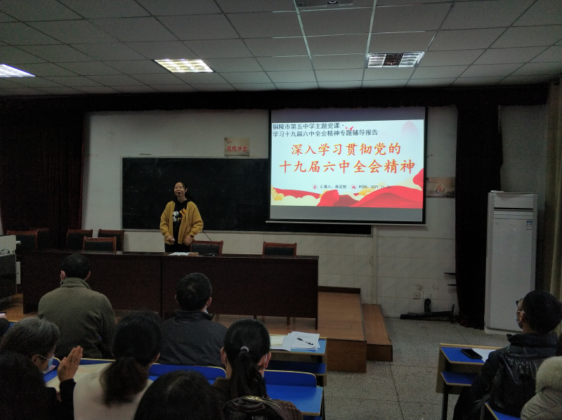 銅陵市青年講師團成員、市五中思想政治教師蔣靈慧老師圍繞十九屆六中全會是個什么會議、為什么備受關注、還有份很重要的決議是個什么決議,帶領大家認真領會全會精神的豐富內(nèi)涵與核心要義。