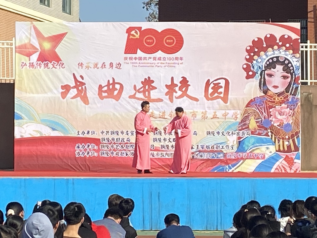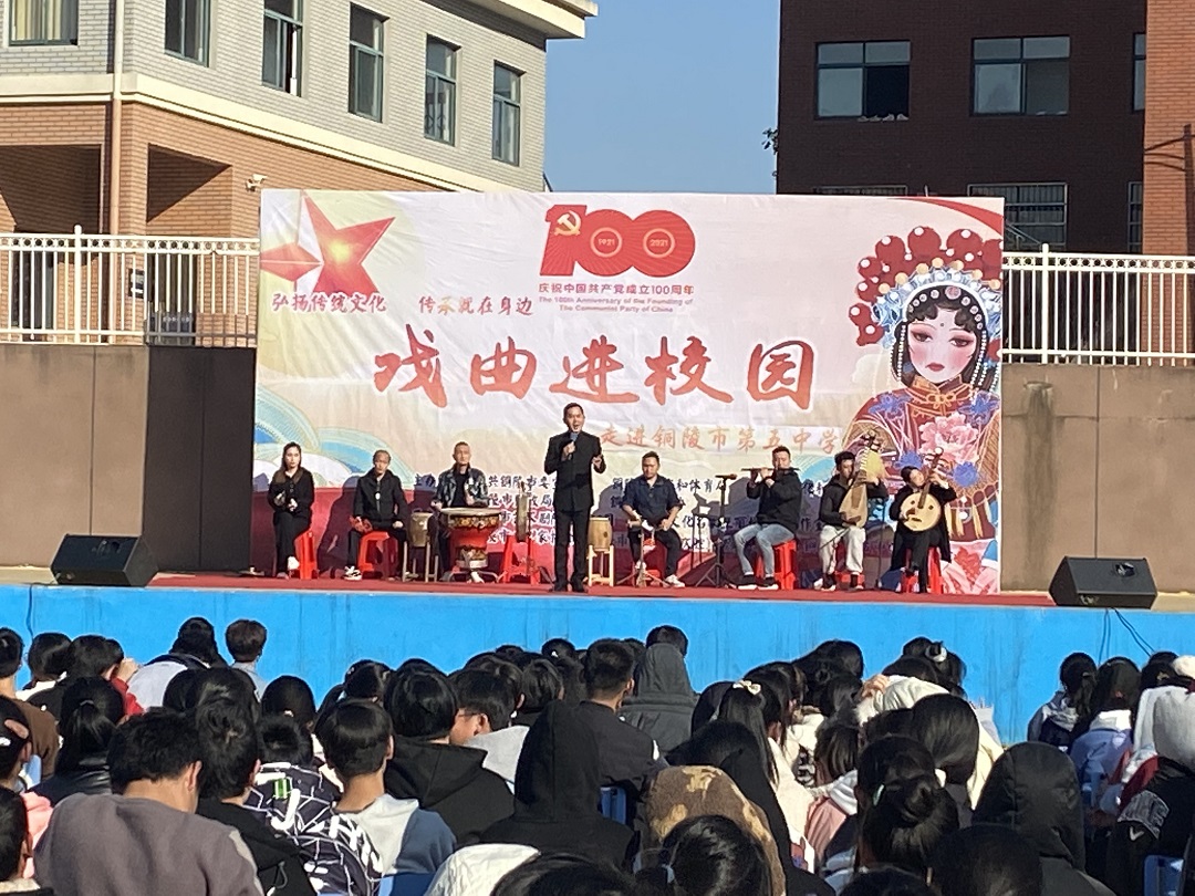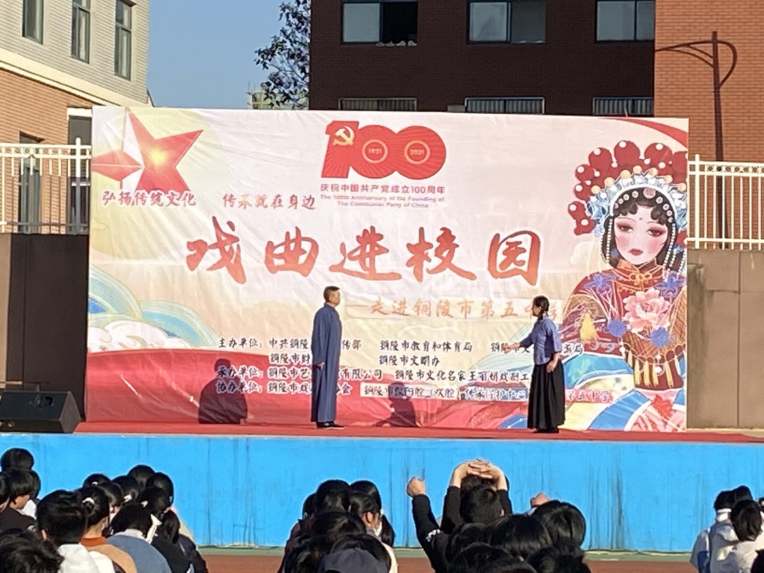 為貫徹教育部關(guān)于“大力推進(jìn)高雅藝術(shù),傳統(tǒng)戲曲進(jìn)校園”的要求,進(jìn)一步弘揚(yáng)中華優(yōu)秀文化,傳承戲曲文化,也為堅(jiān)持“五育并舉”,豐富校園文化生活,培養(yǎng)學(xué)生興趣愛好,促進(jìn)學(xué)生全面發(fā)展,11月25日,由銅陵市委宣傳部、銅陵市教體局、銅陵市文旅局等主辦,銅陵市藝術(shù)劇院、市文化名家王麗娟戲劇工作室和市五中承辦的“戲曲進(jìn)校園”活動(dòng)走進(jìn)銅陵市第五中學(xué)。現(xiàn)場(chǎng),來自市藝術(shù)劇院的演員們用鏗鏘清脆的梨園雅韻為同學(xué)們帶來一場(chǎng)精彩的戲曲藝術(shù)視聽盛宴。