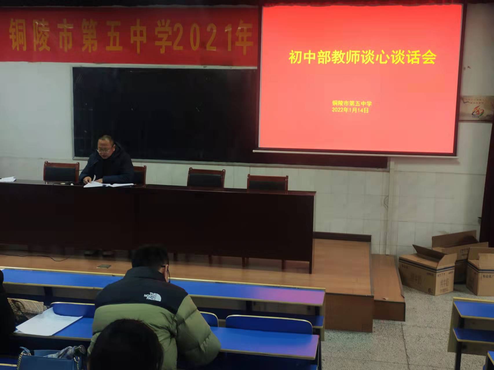 1月14日下午,市五中初中部召開教師談心談話會(huì),初中部中心組成員、全體初中部教師參加會(huì)議,會(huì)議由初中部部長瞿大寨主持。