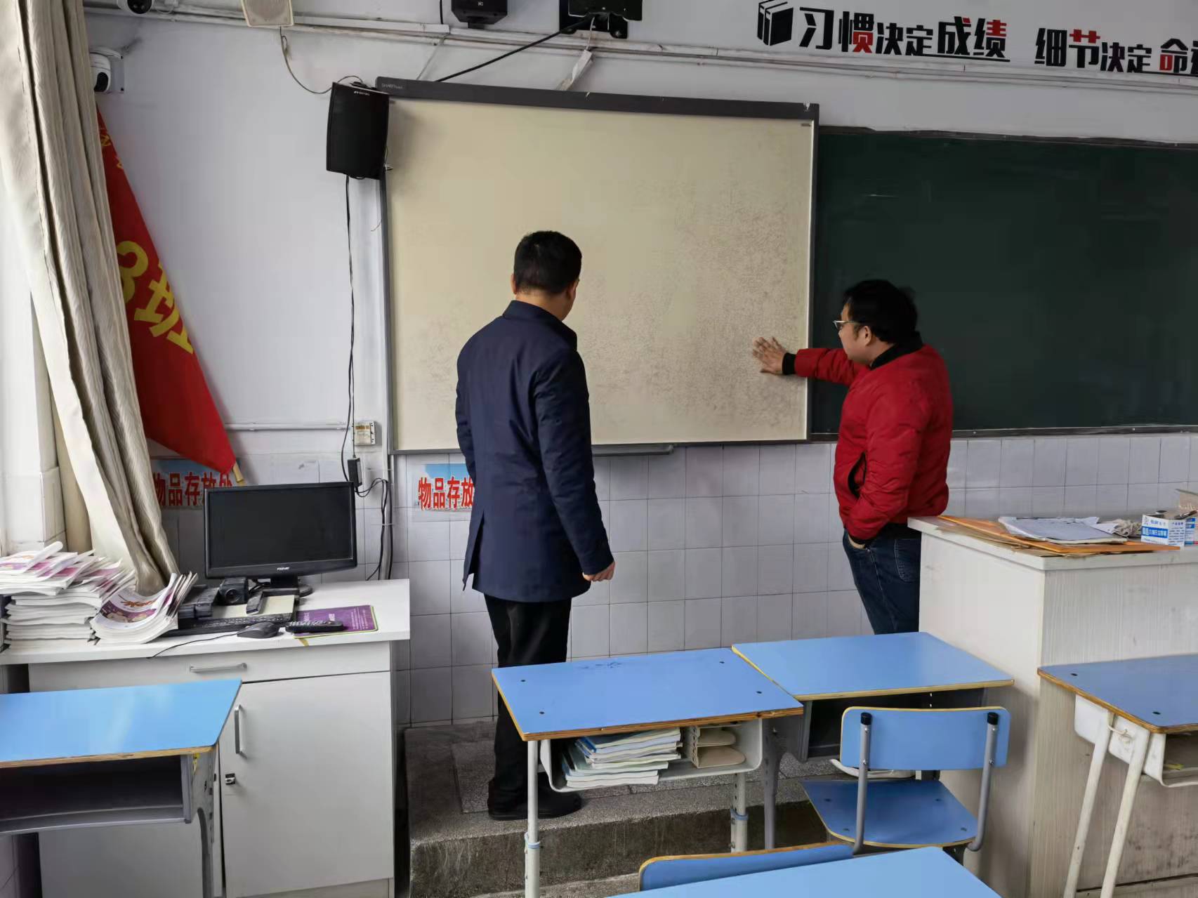 臨近學(xué)期結(jié)束,為了學(xué)校電教設(shè)備的安全管理,也為下學(xué)期能更好地開展教學(xué)工作做好準(zhǔn)備,元月22日中午,在市五中副校長呂建國的帶領(lǐng)下,教務(wù)主任周仁林,政教主任徐蛟龍以及信息中心周成兵一起檢查了班級電教設(shè)備,并做好了問題設(shè)備的統(tǒng)計(jì)工作。此次設(shè)備檢查包括:一、電教設(shè)備是否保持整潔并擺放合理。二、電腦柜、平板充電柜是否鎖好;三、各電教設(shè)備是否切斷電源,無安全隱患。