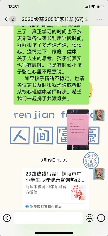疫情一開(kāi)始,市五中就打造了一批由心理健康教師、各班主任組成的心理健康教育團(tuán)隊(duì),通過(guò)微信家長(zhǎng)群,釘釘家校群,把心理健康教師專業(yè)的心理健康理論知識(shí)與班主任豐富的教學(xué)管理實(shí)踐相結(jié)合,給與全校師生以及各家長(zhǎng)有深度、有溫度的疫情防控期間的心理指導(dǎo)。