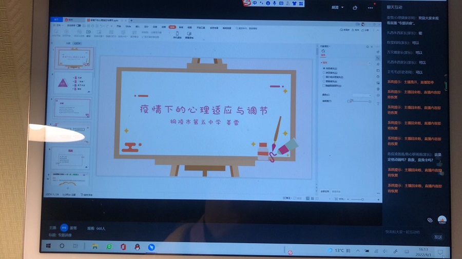 4月1日,市五中各班級(jí)正在開展著一場(chǎng)別開生面的線上心理健康教育講座。心理健康教師姜雪正在和孩子們講述疫情下如何更好地完成心理適應(yīng)與調(diào)節(jié),高效又健康的迎來(lái)戰(zhàn)“疫”的勝利。