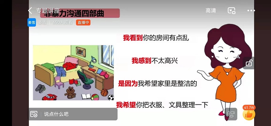 姜老師從網(wǎng)課、“隔離”、親子關(guān)系、睡眠等四個(gè)角度來(lái)分析,有深入淺出的專業(yè)理論知識(shí),更有疫情之下具體的行為指導(dǎo)、學(xué)法指導(dǎo)。她還通過(guò)一些舒緩緊張情緒的動(dòng)作傳授,教會(huì)孩子們當(dāng)壓力來(lái)臨時(shí),如何自我緩解,給與自己積極的心理暗示,必要時(shí)更要學(xué)會(huì)求助。這樣一場(chǎng)“干貨”滿滿的線上教育課堂,得到了參與的學(xué)生及家長(zhǎng)們的極大認(rèn)可,更是我校一直以來(lái)重視心理健康教育的重要體現(xiàn)。