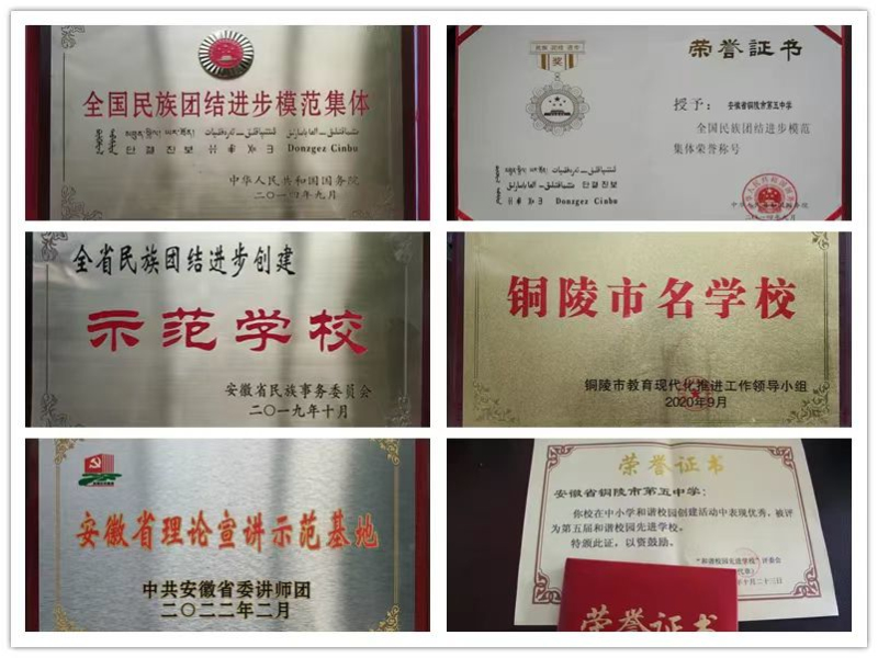 多年來(lái)在各級(jí)領(lǐng)導(dǎo)的關(guān)懷支持下,在全體師生的共同努力下,學(xué)校榮獲國(guó)務(wù)院“全國(guó)民族團(tuán)結(jié)進(jìn)步模范集體”、教育部“和諧校園先進(jìn)學(xué)校”、“安徽省民族團(tuán)結(jié)進(jìn)步示范集體”、中共安徽省委講師團(tuán)“省理論宣講示范基地”等多項(xiàng)榮譽(yù)。