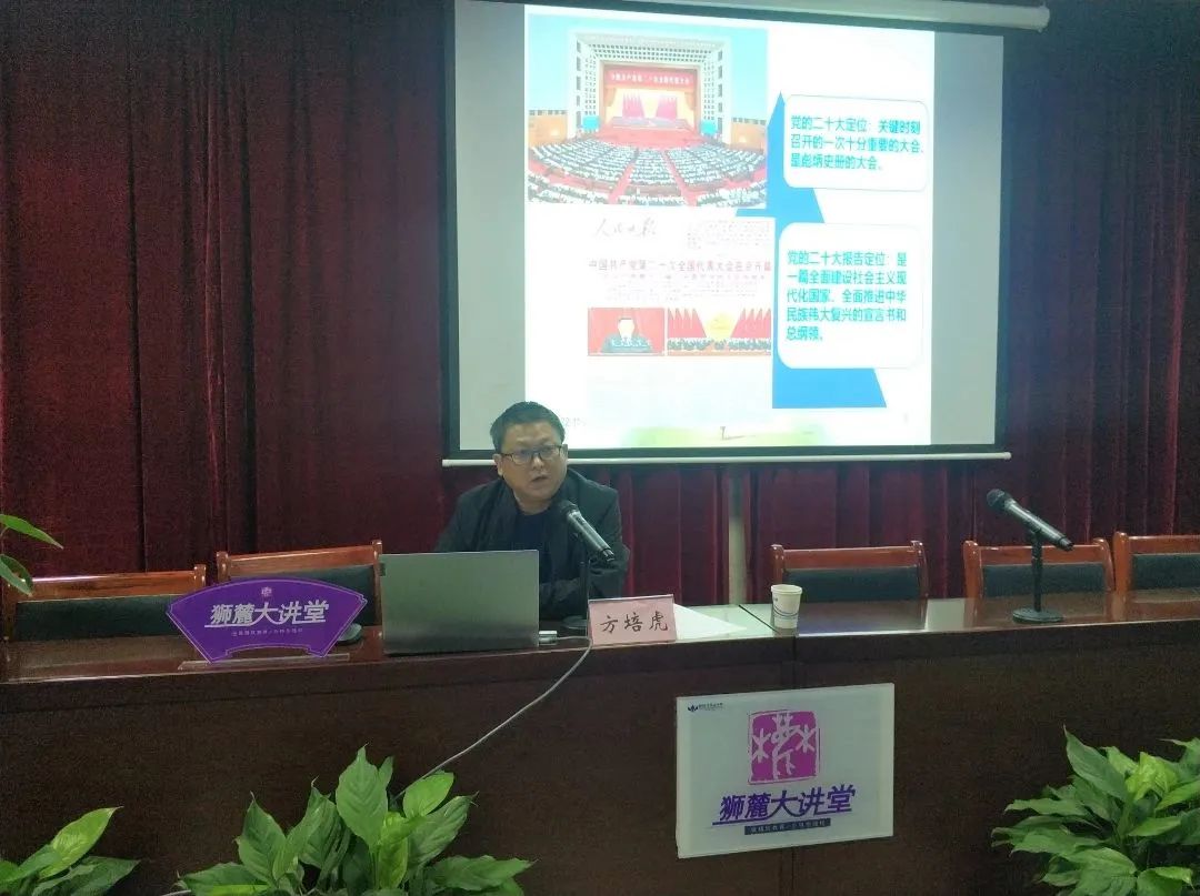 方培虎教授開啟“獅麓大講堂”第一課。他以“全面推進中華民族偉大復興的綱領性文獻--學習貫徹黨的二十大精神”為題對黨的二十大報告進行了全面解讀。整場宣講主題鮮明、內(nèi)容豐富,既全面又深刻,廣大教職工認真聆聽,思想受到深刻洗禮。