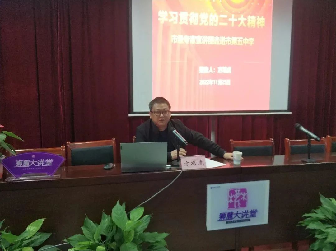 為了完整、準確、全面地學(xué)習(xí)和領(lǐng)會黨的二十大精神,為全面建設(shè)社會主義現(xiàn)代化國家的新征程統(tǒng)一思想、統(tǒng)一意志、統(tǒng)一行動,11月25日,我校特邀市委黨校教授、歷史文化研究會會長、市委宣講團成員、市人大代表方培虎到校宣講黨的二十大精神。校級領(lǐng)導(dǎo)班子和全體教職工參加宣講會,會議由校黨支部副書記楊克貴主持。