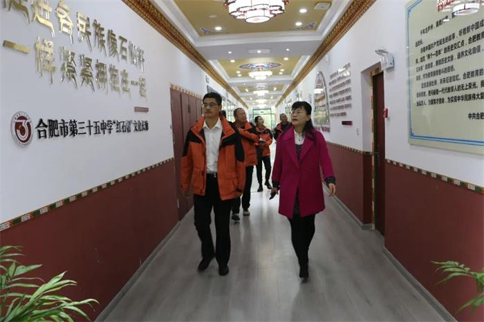 在顧曉惠陪同下,張尤俊一行沿著寬敞整潔的團(tuán)結(jié)大道來(lái)到同德樓先后參觀了合肥市教育發(fā)展展覽館、合肥三十五中紅石榴文化長(zhǎng)廊、學(xué)生心理發(fā)展指導(dǎo)中心。接著,張尤俊一行穿過(guò)了團(tuán)結(jié)廣場(chǎng)來(lái)到文化氣息濃郁的琴珍書苑并打卡留影紀(jì)念,沿著珠峰大道先后參觀了融和樓學(xué)生宿舍、共美樓學(xué)生餐廳等。參觀過(guò)程中,顧曉惠介紹了三十五中“紅石榴”文化、辦學(xué)特色、辦學(xué)成果以及學(xué)校新班子上任以來(lái),學(xué)校發(fā)生的翻天覆地的變化。張尤俊對(duì)三十五中校園文化建設(shè)給予高度評(píng)價(jià)。