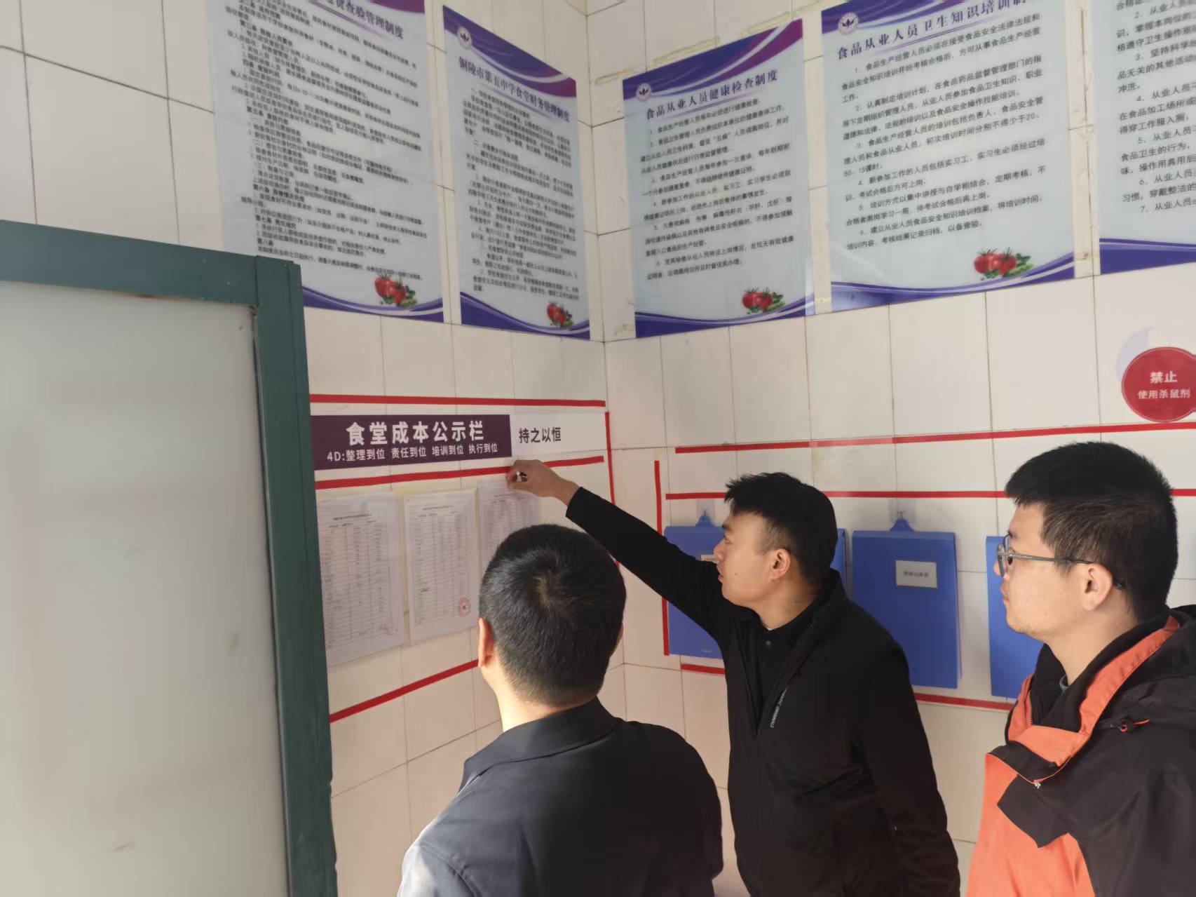 會后,大家一同深入食堂一線,開展現(xiàn)場辦公檢查。先后查看食堂公示欄信息公示情況、食材展示區(qū)保管與溯源情況、洗消間設(shè)備運行與操作規(guī)范等重點區(qū)域,逐項排查問題、現(xiàn)場督導(dǎo)整改,確保食品安全各項要求落地見效,以實地核驗壓實監(jiān)管責(zé)任,筑牢校園食安堅固屏障。
