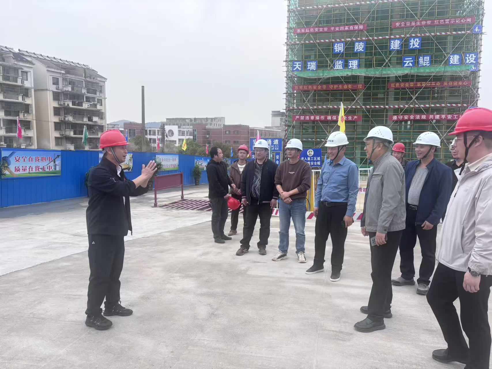 為扎實推進銅陵五中錯那班宿舍樓標化場地創(chuàng)建工作,筑牢清明節(jié)前安全生產(chǎn)防線,壓實住建領(lǐng)域安全責任,4月2日下午,銅陵市住房和城鄉(xiāng)建設(shè)局黨組書記、局長黃捍東帶領(lǐng)局相關(guān)科室負責人,深入銅陵五中錯那班宿舍樓工程項目建設(shè)現(xiàn)場,開展節(jié)前安全生產(chǎn)專項督導檢查,全面核查項目安全質(zhì)量與標化創(chuàng)建成效。校黨總支委員、分管校長陳浩,學?倓(wù)處相關(guān)工作人員及項目施工、代建、監(jiān)理等各參建單位負責人全程陪同參與督導。